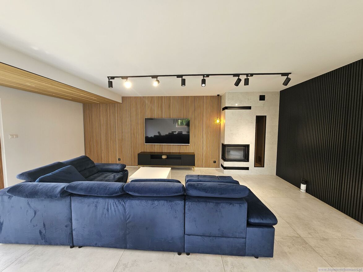 W salonie reprezentacyjny kominek, telewizor smart 65". Wysokość salonu około 280cm.