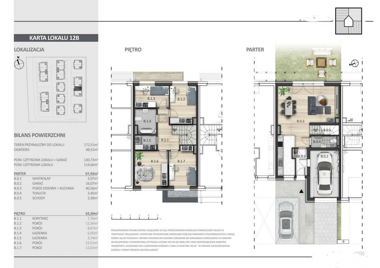 Prezentowany dom ma powierzchnię użytkową 130,73 m2, ogród ma powierzchnię 43,04m2.