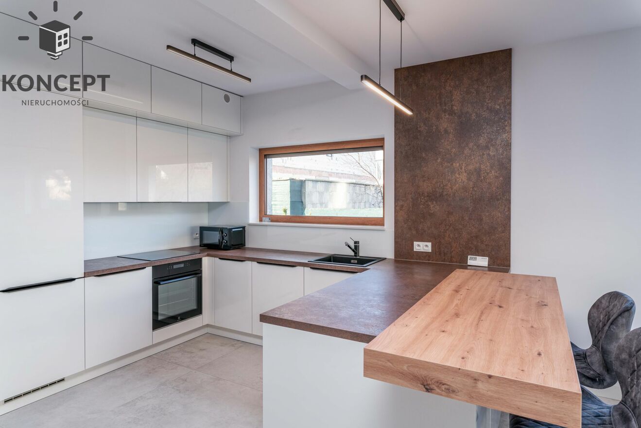 Kuchnia została wyposażona w wysokiej jakości sprzęty takie jak: zmywarka, lodówka, płyta indukcyjna i piekarnik.